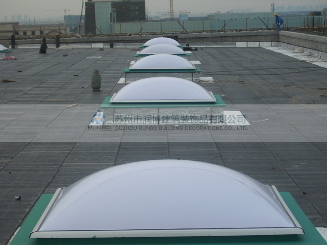 1 .天窗采光罩部分分為單層和雙層,單層采光罩厚度一般為4.5毫米,雙層采光罩厚度一般為3+4.5毫米。罩體形狀為球型或金字塔形狀,下口部位可制作成長方形﹑正方形﹑圓形﹑三角形﹑梯形等各種形狀。